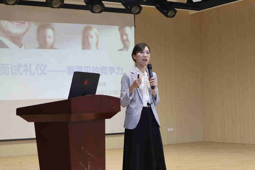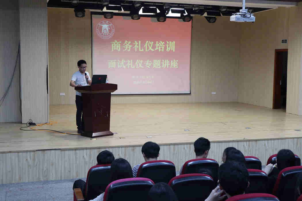 为增加我校学生对面试礼仪知识的了解,培养良好的精神面貌,树立良好的仪容仪表形象,4月26日下午,我院特邀国家注册高级礼仪培训师谢婧老师于商学楼408举办商务礼仪培训之面试礼仪专题讲座。商学院党总支书记王福清老师、团委副书记周郭灵智老师及各院系学生参加本次讲座。本次讲座由王福清老师主持,谢婧老师主讲。